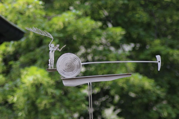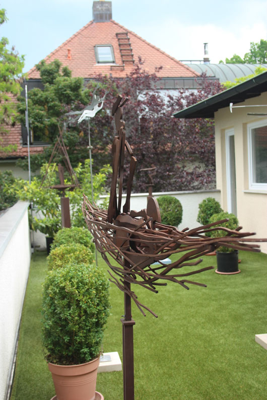 Mit Sommerbeginn hat der KunstRaum Bernusstraße auf der Dachterrasse einen Skulpturengarten mit Arbeiten von Rainer Henze bekommen, der mit kleinen Skulpturen und Radierungen schon länger in der Galerie vertreten ist. Sie sind einen gute Ergänzung zum Balancierenden von Hubertus von der Goltz, der schon seit Jahren Markenzeichen der Galerie ist.