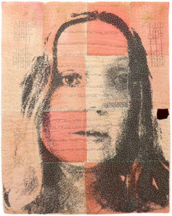Gisela Hafer arbeitet mit textilem Material. Fotos, Zeitungsartikel und Fundstücke werden als