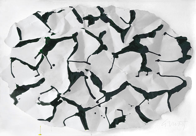 Neben der beeindruckenden Vielfalt der Bronzen bieten die späten, weitgehend unbekannten Papierreliefs ein Highlight der Frankfurter Ausstellung. In ihnen hat Cimiotti sein Hauptthema der "Strukturen" nochmals über den Weg kühner Papierbehandlungen - Risse, Falten, amorphe Knautschung und gelenkte Stege - erweitert. Eine für ihn ungewohnte starke Farbigkeit unterstützt zusätzlich den Ausdruck neuer Intensität und Lebensfülle.