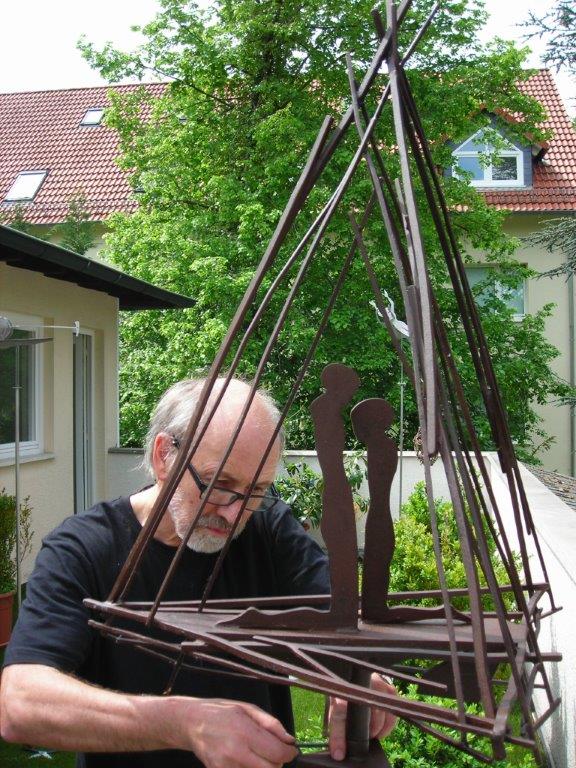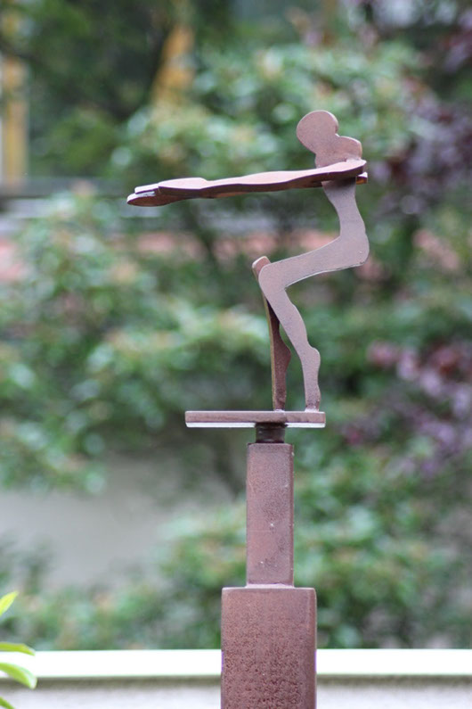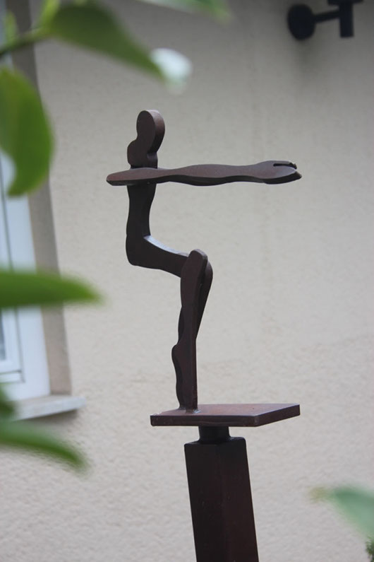 Mit Sommerbeginn hat der KunstRaum Bernusstraße auf der Dachterrasse einen Skulpturengarten mit Arbeiten von Rainer Henze bekommen, der mit kleinen Skulpturen und Radierungen schon länger in der Galerie vertreten ist. Sie sind einen gute Ergänzung zum Balancierenden von Hubertus von der Goltz, der schon seit Jahren Markenzeichen der Galerie ist.